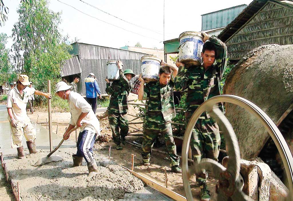 Cán bộ, chiến sĩ biên phòng chung tay xây dựng nông thôn mới. Ảnh: ML