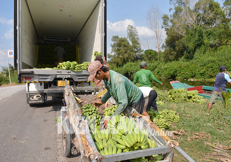 Nông dân xã An Minh Bắc, huyện U Minh Thượng (Kiên Giang) thu hoạch chuối xiêm bán cho thương lái.