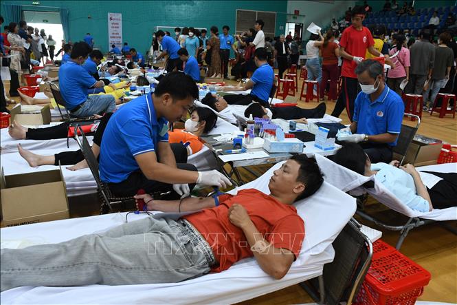 | 800 tình nguyện viên gồm người dân, học sinh-sinh viên, công nhân viên chức, lực lượng vũ trang đã tham gia hiến máu tình nguyện tại Chương trình Hành trình Đỏ lần 6. (Ảnh: Huỳnh Sơn/TTXVN) |