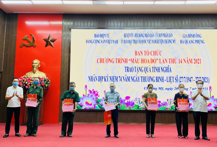 Nhân dịp này, Ban tổ chức Chương trình "Màu hoa đỏ" năm 2021 cùng các đơn vị tài trợ, nhà hảo tâm đã trao tặng 100 suất quà (1 triệu đồng/suất) cho các gia đình chính sách có hoàn cảnh khó khăn trên địa bàn huyện Chương Mỹ; trao 70 triệu đồng hỗ trợ nâng cấp nhà tình nghĩa cho gia đình ông Trương Bá Khàng và bà Nguyễn Thị Ngội có con trai là liệt sĩ tại đội 1, thôn Đồng Lệ, xã Hợp Đồng, huyện Chương Mỹ, Hà Nội./.