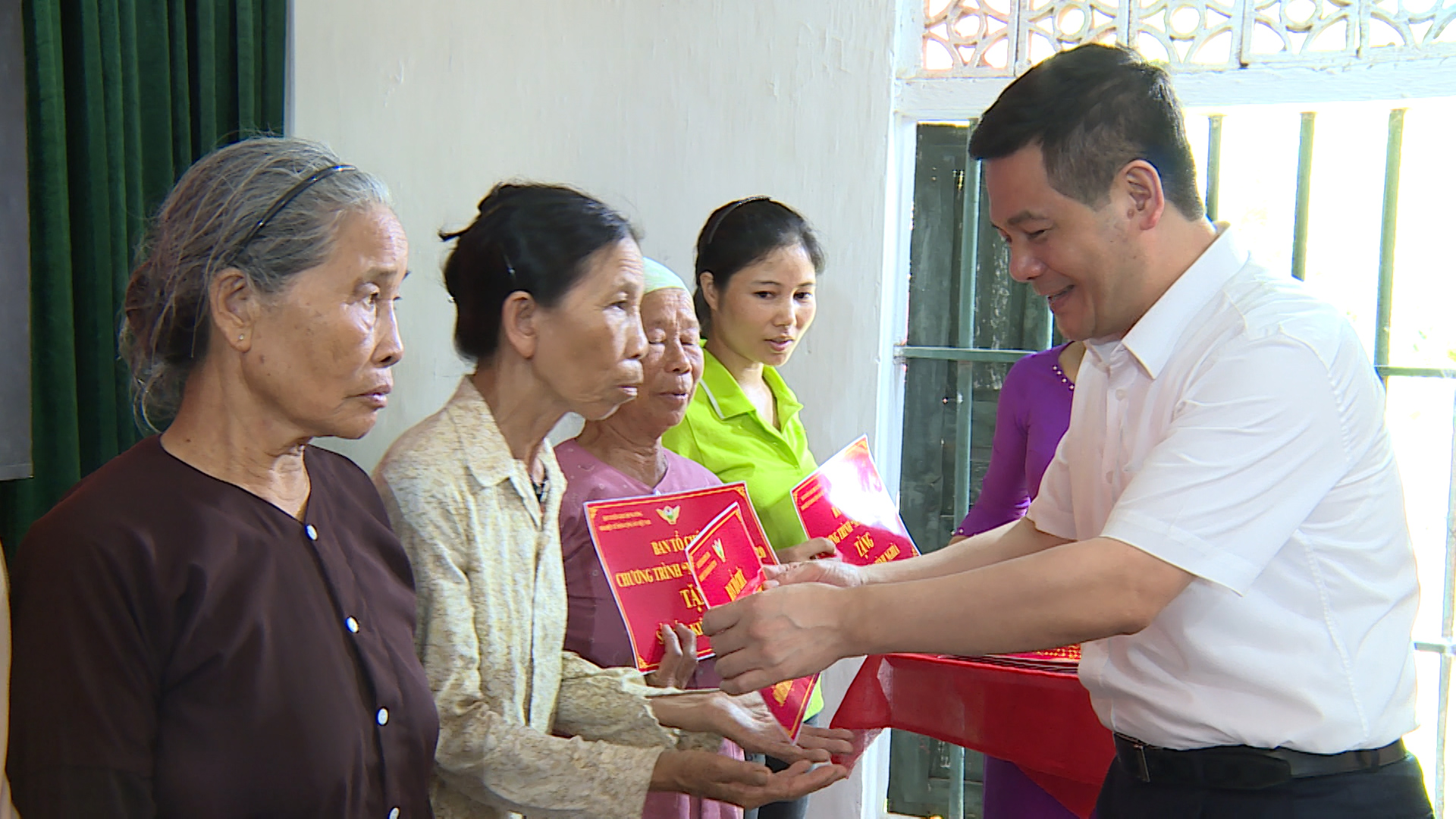 | Ban Tổ chức Chương trình "Màu hoa đỏ" năm 2020 trao sổ tiết kiệm cho các gia đình chính sách tại xã Nam Hải, huyện Tiền Hải. (Ảnh:PV) |
