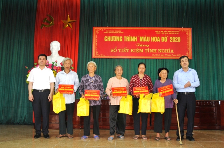 Trong khuôn khổ chương trình, đồng chí Nguyễn Hồng Diên, đồng chí Ngô Đông Hải cùng Ban tổ chức Chương trình "Màu hoa đỏ" năm 2020 và đại diện nhà tài trợ đã trao tặng 10 sổ tiết kiệm cho đại diện các hộ gia đình chính sách có hoàn cảnh đặc biệt khó khăn, Mẹ Việt Nam Anh hùng và người có công với cách mạng trên địa bàn xã Tân Học, huyện Thái Thụy, tỉnh Thái Bình; trao 20 sổ tiết kiệm cho các gia đình chính sách khó khăn tại xã Nam Hải, huyện Tiền Hải, tỉnh Thái Bình./.