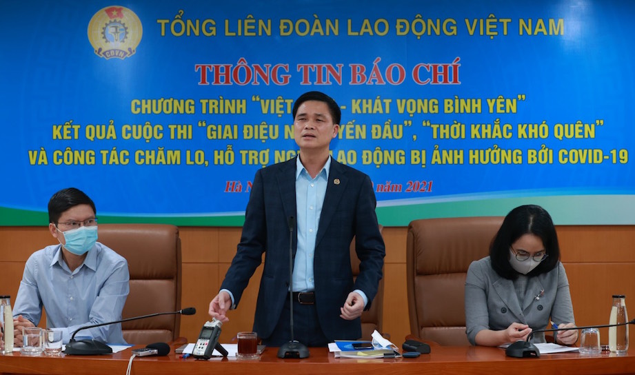 Chiều 28/10, tại Hà Nội, Tổng Liên đoàn Lao động (LĐLĐ) Việt Nam tổ chức họp báo thông tin về chương trình “Việt Nam - Khát vọng bình yên”, kết quả Cuộc thi “Giai điệu nơi tuyến đầu”, “Thời khắc khó quên” và công tác chăm lo, hỗ trợ người lao động bị ảnh hưởng bởi COVID-19.