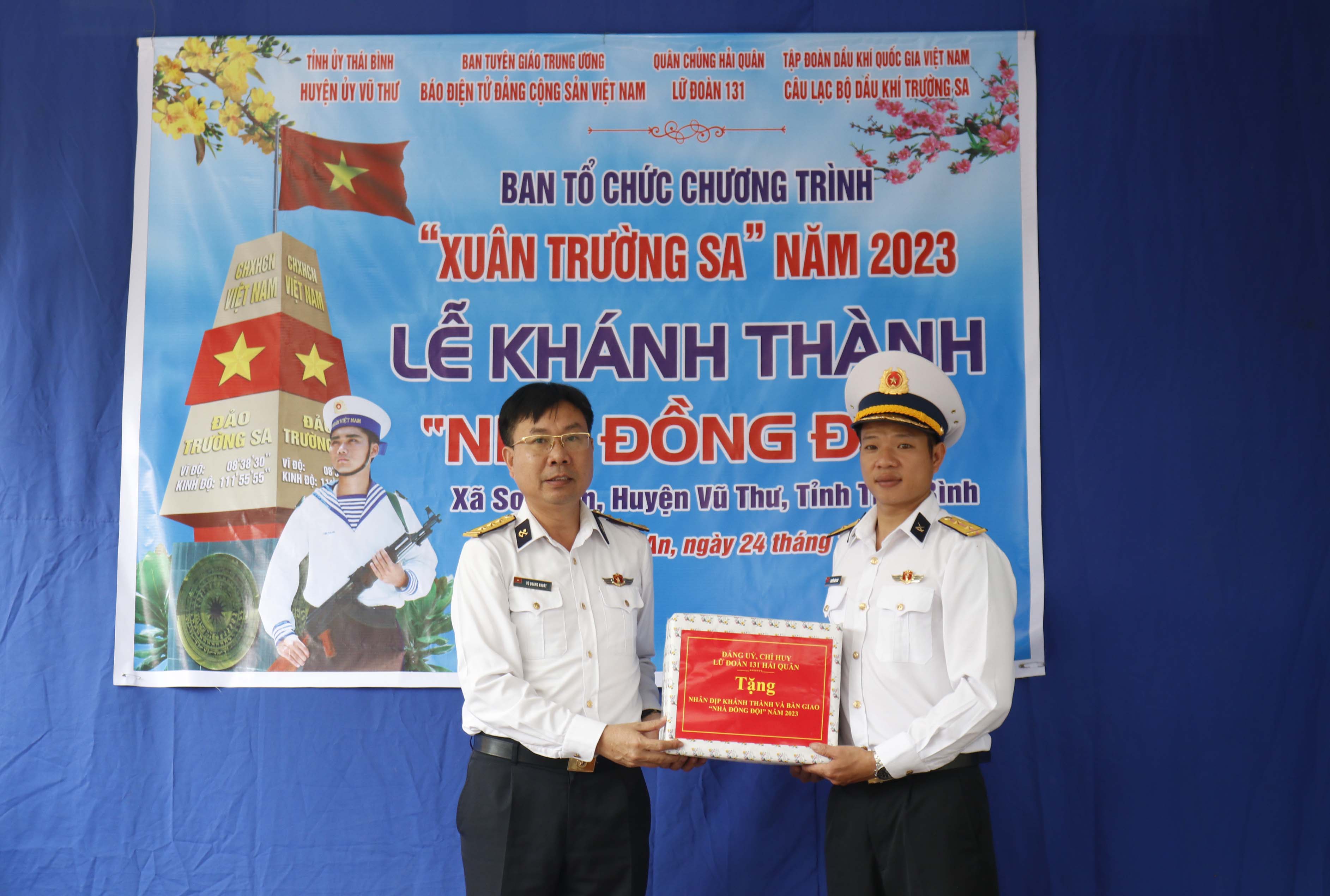Thay mặt Lữ đoàn 131 (Quân chủng Hải quân), Thượng tá Vũ Quang Khoát, Phó Chính ủy Lữ đoàn 131 bày tỏ cảm ơn Ban Tổ chức Chương trình Xuân Trường Sa 2023, Báo điện tử Đảng Cộng sản Việt Nam, Câu lạc bộ Dầu khí Trường Sa Tập đoàn Dầu khí quốc gia Việt Nam đã hỗ trợ xây dựng “Nhà đồng đội” tặng cán bộ, chiến sĩ có hoàn cảnh khó khăn về nhà ở của Lữ đoàn.