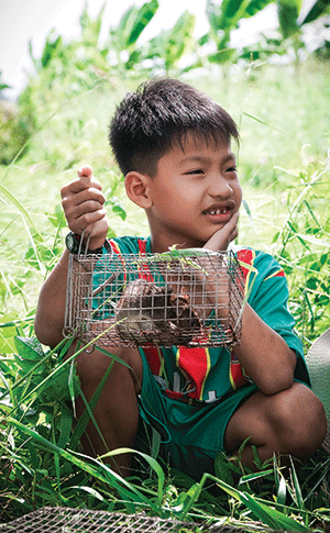 | Một cậu bé vui với chiếc rập vừa bẫy được chuột. |