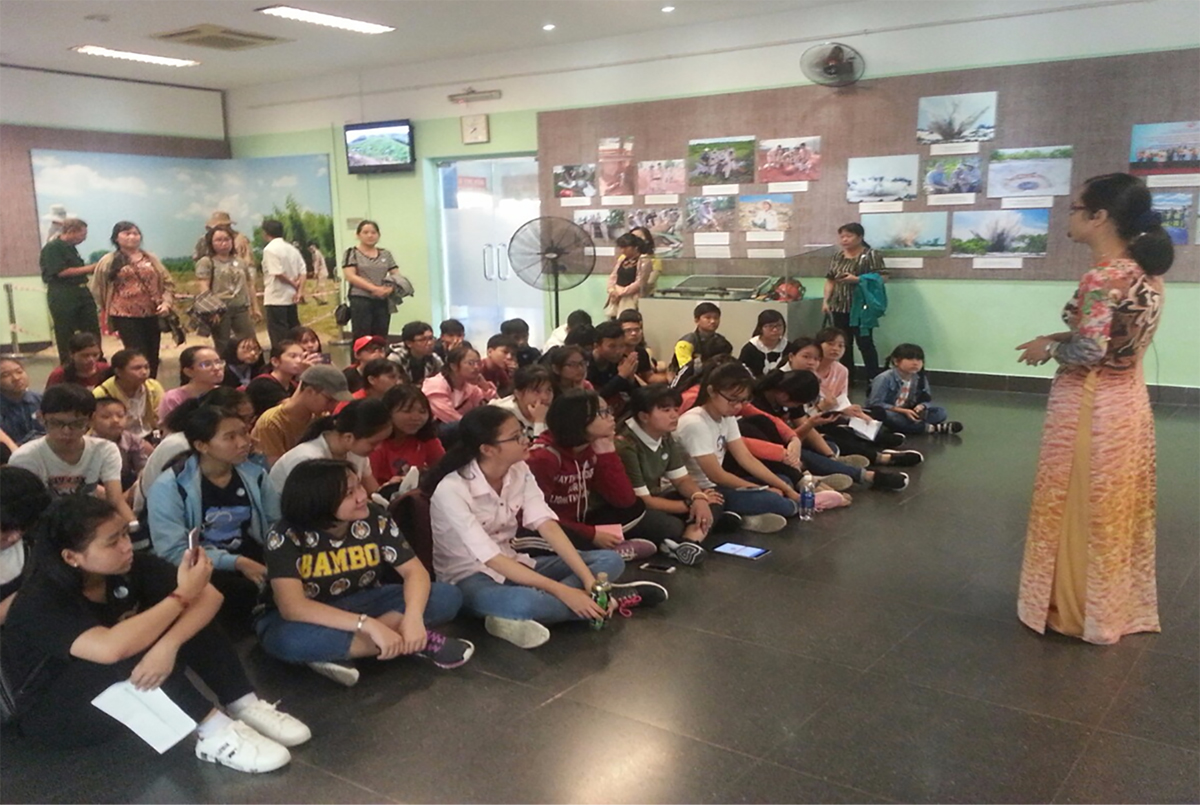Học sinh Trường THCS An Thới chăm chú nghe thuyết minh tại Bảo tàng Chứng tích chiến tranh tại TP Hồ Chí Minh. Ảnh: Phòng Giáo dục Trung học cung cấp
