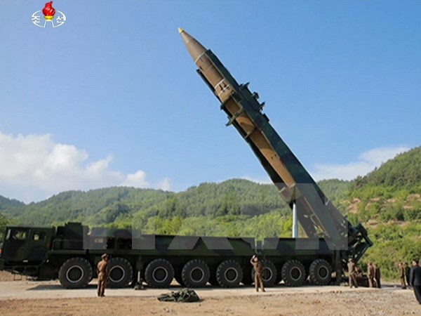 Tên lửa đạn đạo liên lục địa Hwasong-14 được phóng thử thành công tại một địa điểm ở Triều Tiên ngày 04/7. (Nguồn: YONHAP/TTXVN)