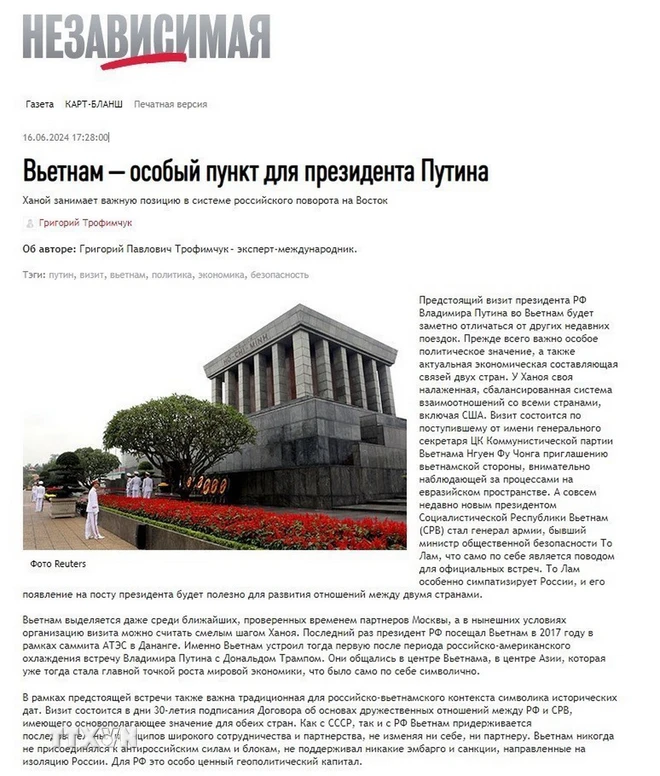 Báo Độc lập - chuyên trang phân tích chính trị, thời sự uy tín của Nga - vừa đăng tải bài viết với nhan đề “Việt Nam - Điểm đến đặc biệt của Tổng thống Vladimir Putin” của tác giả, nhà phân tích thời sự quốc tế Grigory Trofimchuk.