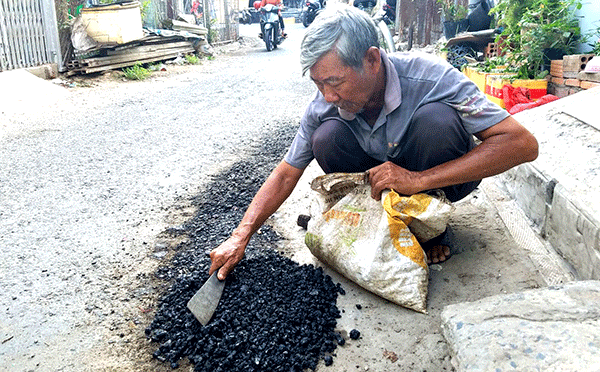 Ðôi tay chai sần hốt từng nắm bê tông nhựa rải xuống chỗ đường bị bong tróc, sau đó ông Long dùng dao cào bằng rồi lấy đá nện chặt lại. Ðó là hình ảnh người dân ở Long Xuyên thường thấy trên những con đường loang lổ. Hơn 6 năm qua, công việc ấy được ông Long lặp đi lặp lại để góp phần làm những con đường thêm phẳng phiu, bền đẹp.