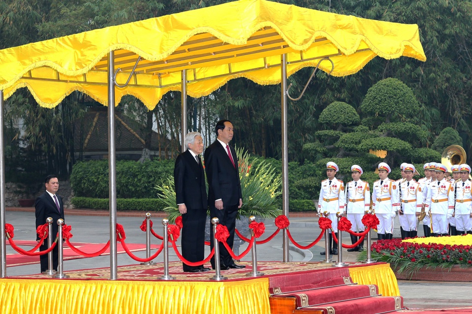 Trong bầu không khí thắm tình hữu nghị và ấm cúng, Chủ tịch nước Trần Đại Quang và Phu nhân nhiệt liệt chào mừng Nhà vua và Hoàng hậu lần đầu tiên có chuyến thăm cấp Nhà nước tới Việt Nam trong những ngày đầu xuân mới, coi đây là chuyến thăm có ý nghĩa lịch sử trong quan hệ hai nước; bày tỏ tin tưởng rằng chuyến thăm của Nhà vua và Hoàng hậu sẽ góp phần tăng cường sự tin cậy, hiểu biết và tình cảm giữa nhân dân hai nước, qua đó phát triển hơn nữa quan hệ đối tác chiến lược sâu rộng Việt Nam - Nhật Bản trong thời gian tới.