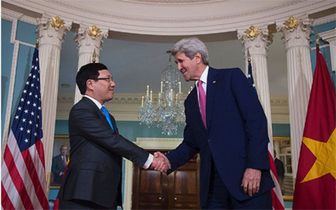 Quan hệ Việt - Mỹ có nhiều bước phát triển tốt đẹp. (Trong ảnh là Phó Thủ tướng Phạm Bình Minh bắt tay Ngoại trưởng Mỹ John Kerry tại Washington D.C. hồi tháng 3) - (Ảnh: AFP)