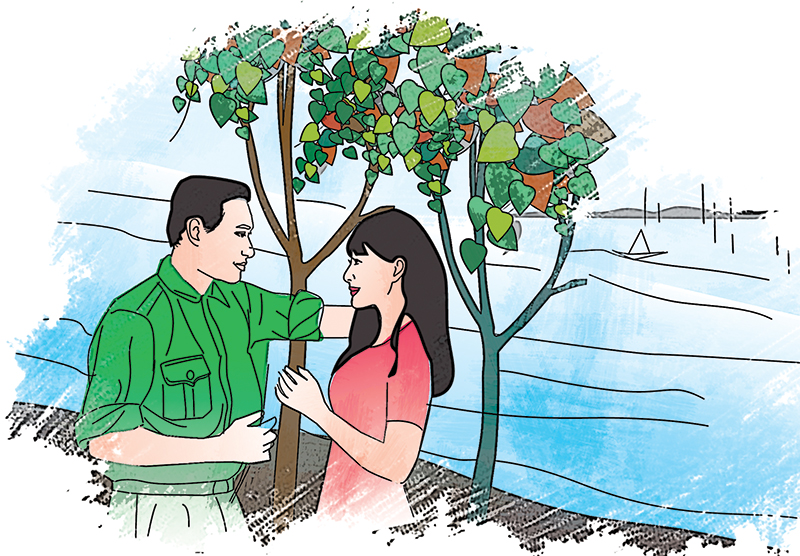 Ngày Mai Trang trở lại đảo, hai cây song đôi lớn lên như một cặp trai gái yêu nhau. Những chiếc lá hình trái tim lướt nhẹ theo làn gió biển, mơn man từng ngón tay cô. Mai Trang có cảm giác mình đang nghe được cả tiếng tí tách thì thầm chuyển nhựa trong từng huyết mạch diệp lục lá cây. Cô hồn nhiên reo lên như trẻ nhỏ khi nhìn thấy sự chuyển mình rạo rực của tán lá xòe ra một phía về hướng đặt những dãy ghế đá công viên tuổi trẻ lính đảo Trường Sa còn ấm hơi người.
