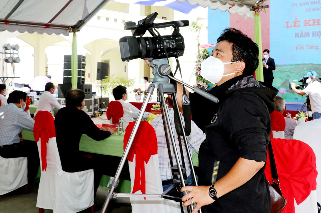 Để đáp ứng yêu cầu, nhiệm vụ của công việc đòi hỏi phóng viên cơ sở phải biết nhiều kỹ năng, nghiệp vụ (Trong ảnh: Phóng viên Tuấn Hùng tác nghiệp quay phim)