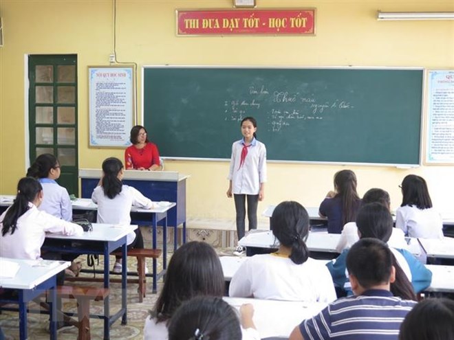 Em Nguyễn Thị Bạch Dương trong lớp học. (Ảnh: Mạnh Minh/TTXVN)