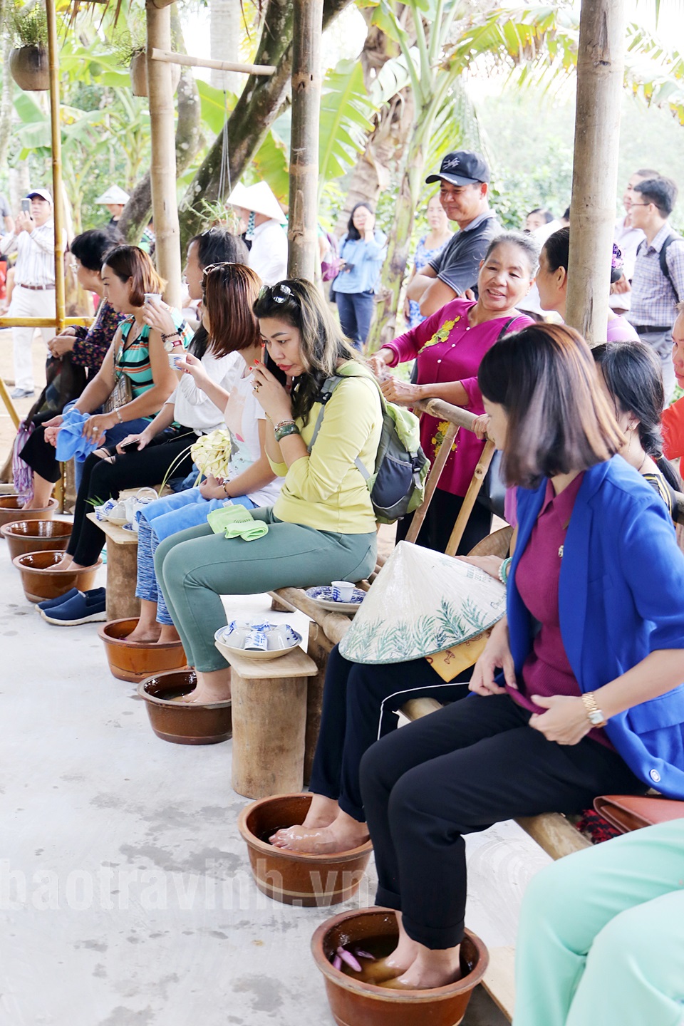Du khách trải nghiệm dịch vụ ngâm chân vào thảo dược tại điểm du lịch sinh thái Cồn Hô.