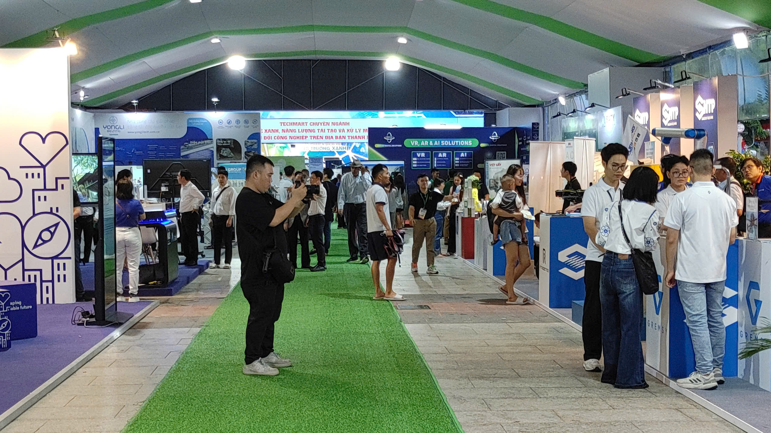 Một điểm nhấn của GRECO 2024 là khu vực “Chợ công nghệ và thiết bị chuyên ngành (Techmart)”, nơi giới thiệu công nghệ xanh, năng lượng tái tạo và xử lý môi trường phục vụ chuyển đổi công nghiệp. Các gian hàng tại đây trưng bày các quy trình và thiết bị năng lượng tái tạo và các giải pháp xử lý môi trường, phục vụ cho nhu cầu chuyển đổi công nghiệp hiện đại. Sự kiện năm nay có sự tham gia của hơn 100 doanh nghiệp, tổ chức, và hiệp hội trong và ngoài nước, quy tụ những thương hiệu hàng đầu trong các lĩnh vực công nghệ và sản phẩm thân thiện với môi trường. Các gian hàng được thiết kế đẹp mắt, mang thông điệp và câu chuyện chuyển đổi xanh riêng của mỗi đơn vị tham gia.