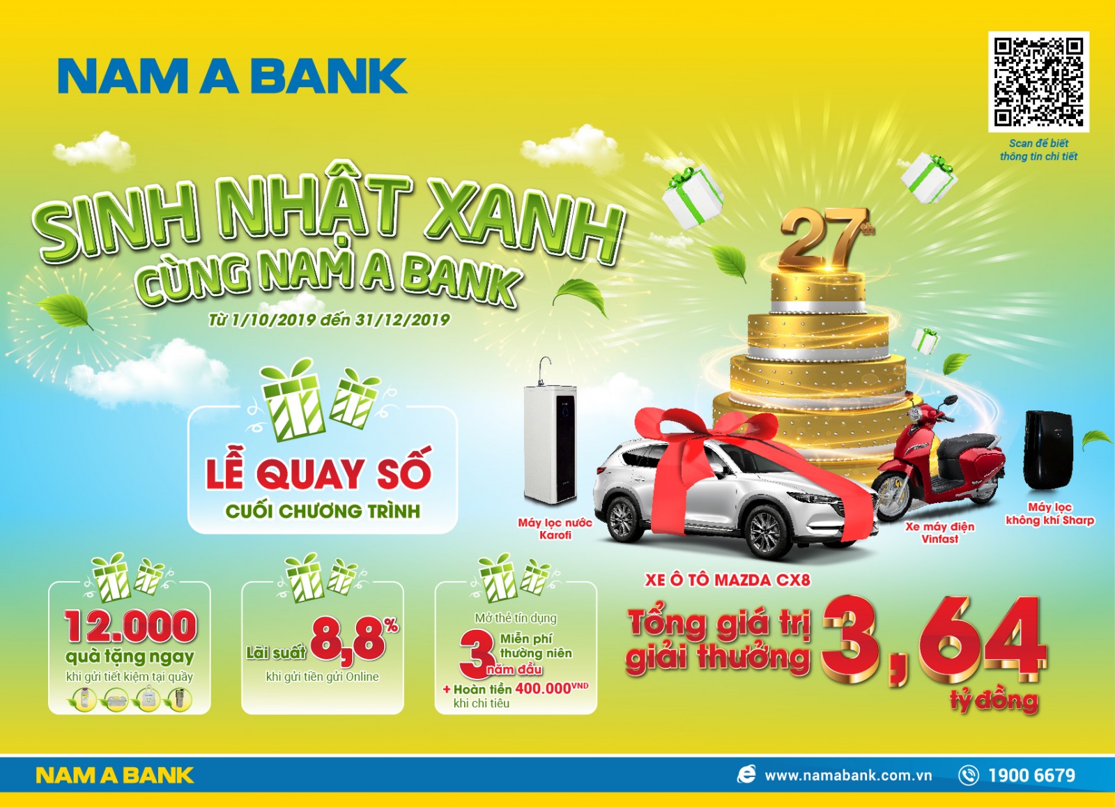 Từ 01/10 đến 31/12/2019, chỉ cần gửi tiết kiệm, khách hàng sẽ được tham gia chương trình khuyến mãi “Sinh nhật xanh cùng Nam A Bank” và có cơ hội rước ngay xe Mazda CX8, xe máy điện Vinfast, máy lọc nước Karofi, máy lọc không khí Sharp cùng vô số quà tặng thân thiện với môi trường. Đây là chương trình khuyến mãi lớn nhất của Nam A Bank chào mừng kỷ niệm 27 năm thành lập Ngân hàng (21/10/1992-21/10/2019) với tổng giá trị giải thưởng 3,64 tỷ đồng.