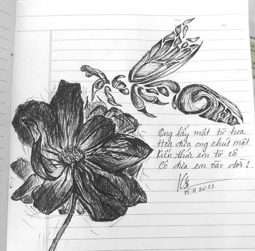 Bước vào môi trường học tập mới, Nguyễn Ngọc Bảo Gia Hân - HS lớp 10TNA1, Trường THPT Đức Hòa (huyện Đức Hòa), chưa một lần được gặp trực tiếp thầy, cô của mình. Tuy nhiên, em vẫn cảm nhận được sự quan tâm chân thành, tận tụy trong giảng dạy của thầy, cô ở trường mới, đặc biệt là cô giáo chủ nhiệm. Nhân dịp ngày 20/11, Hân tự tay vẽ một bức tranh kèm lời tri ân gửi đến cô của mình. Hân chia sẻ: “Đó là bức tranh vẽ một bông hoa và chú ong với ý nghĩa, cô như bông hoa rực rỡ, em như chú ong mới bước vào đời, những kiến thức cô truyền thụ, em rất trân trọng và biết ơn, đó sẽ là hành trang cho em bước vào đời”.