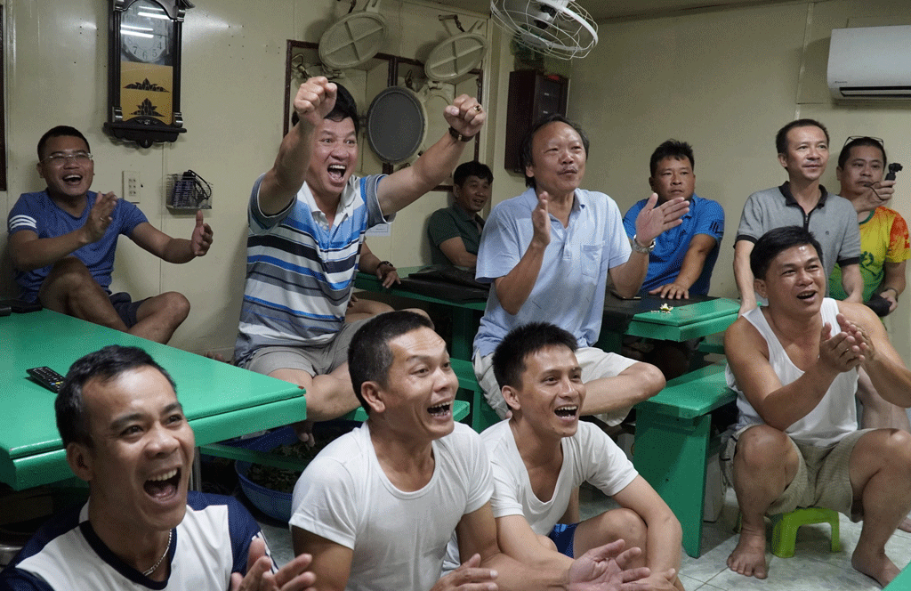Những ngày có Đội tuyển Việt Nam thi đấu ở AFF Cup 2022, cứ chập tối là các thành viên tàu Trường Sa 10 lại í ới gọi nhau xuống phòng ăn, ngay cạnh bếp để ngồi xem và cổ vũ cho đội nhà. Không băng rôn, khẩu hiệu hay loa kèn in ỏi, nhưng từng đường bóng, từng cơ hội, bàn thắng mà các học trò Huấn luyện viên Park Hang Seo thể hiện luôn được bám sát, theo dõi.