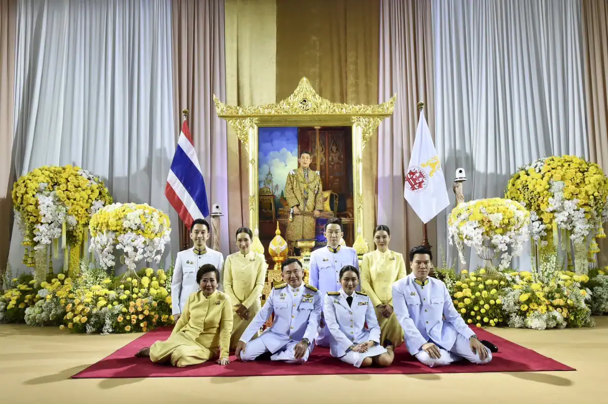 Vợ chồng tân Thủ tướng Thái Lan Paetongtarn Shinawatra (hàng đầu bên phải) cùng cha mẹ. Hàng sau là vợ chồng anh trai và vợ chồng chị gái tại lễ tiếp nhận sắc phong hoàng gia hôm 18-8. Ảnh: AP