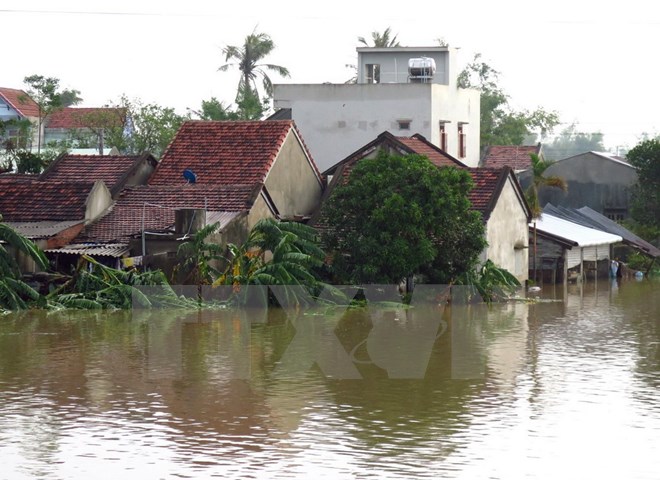 Nhiều khu dân cư thuộc địa bàn các huyện Phú Hòa, Đông Hòa, Tuy An, Đồng Xuân… của tỉnh Phú Yên bị ngập. (Ảnh: Thế Lập/TTXVN)