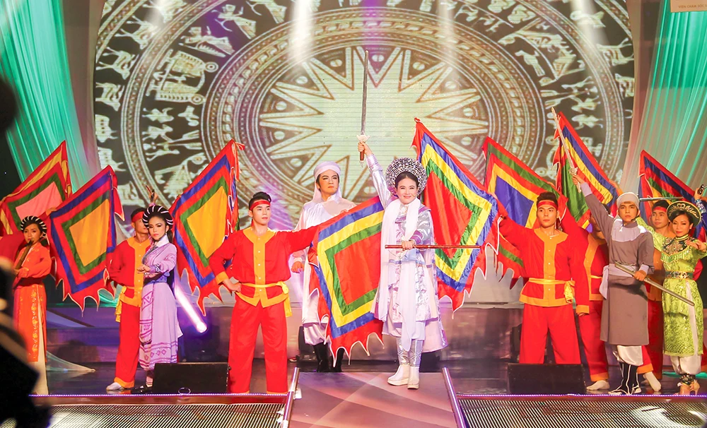 NSND Thanh Ngân trong trích đoạn “Tiếng trống Mê Linh” của soạn giả Vĩnh Điền. Ảnh: DUY KHÔI