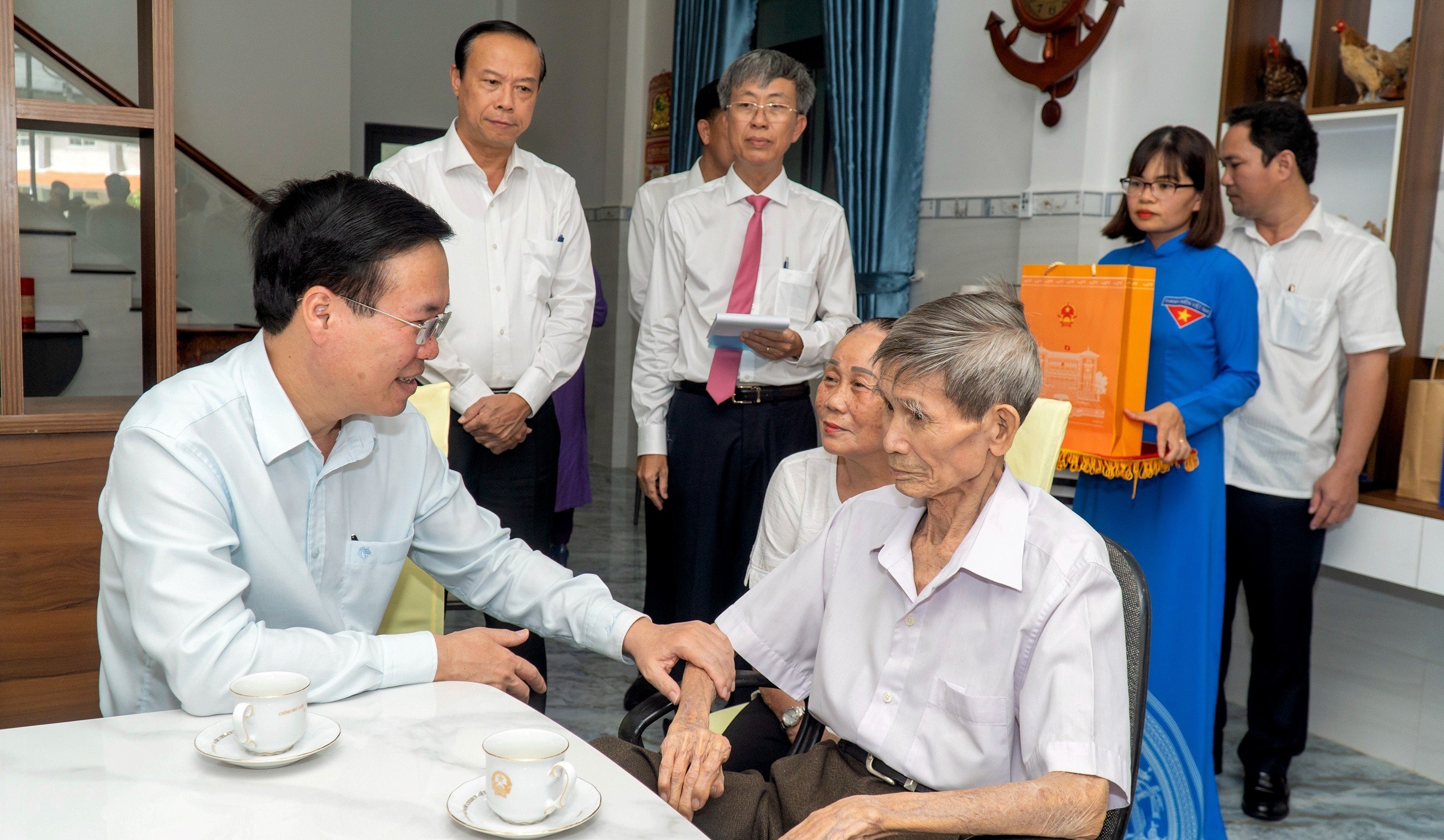 | Chủ tịch nước Võ Văn Thưởng tới thăm, động viên cựu tù chính trị Côn Đảo Nguyễn Xuân Viên nhân dịp kỷ niệm 76 năm Ngày Thương binh-Liệt sĩ. |