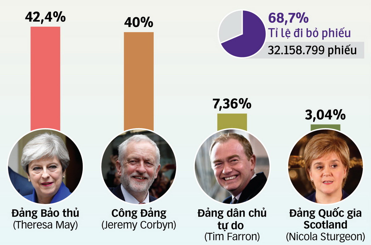 Kết quả kiểm phiếu cho thấy đảng của bà Theresa May giành 318 ghế (42,45% phiếu), đảng của ông Jeremy Corbyn giành 261 ghế (39,98% phiếu), trong khi hai đảng nhỏ Dân chủ tự do và SNP giành lần lượt 12 ghế (7,36% phiếu) và 35 ghế (3,04% phiếu), trên tổng số 650 ghế của Hạ viện.