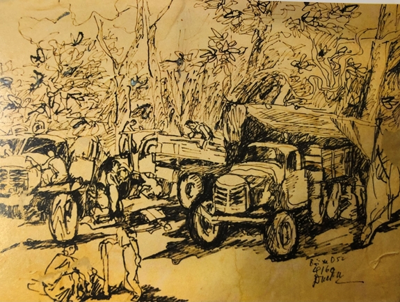 | Tác phẩm “Bãi xe tiểu đoàn 52” - Kí họa bút sắt, được trưng bày tại triển lãm |