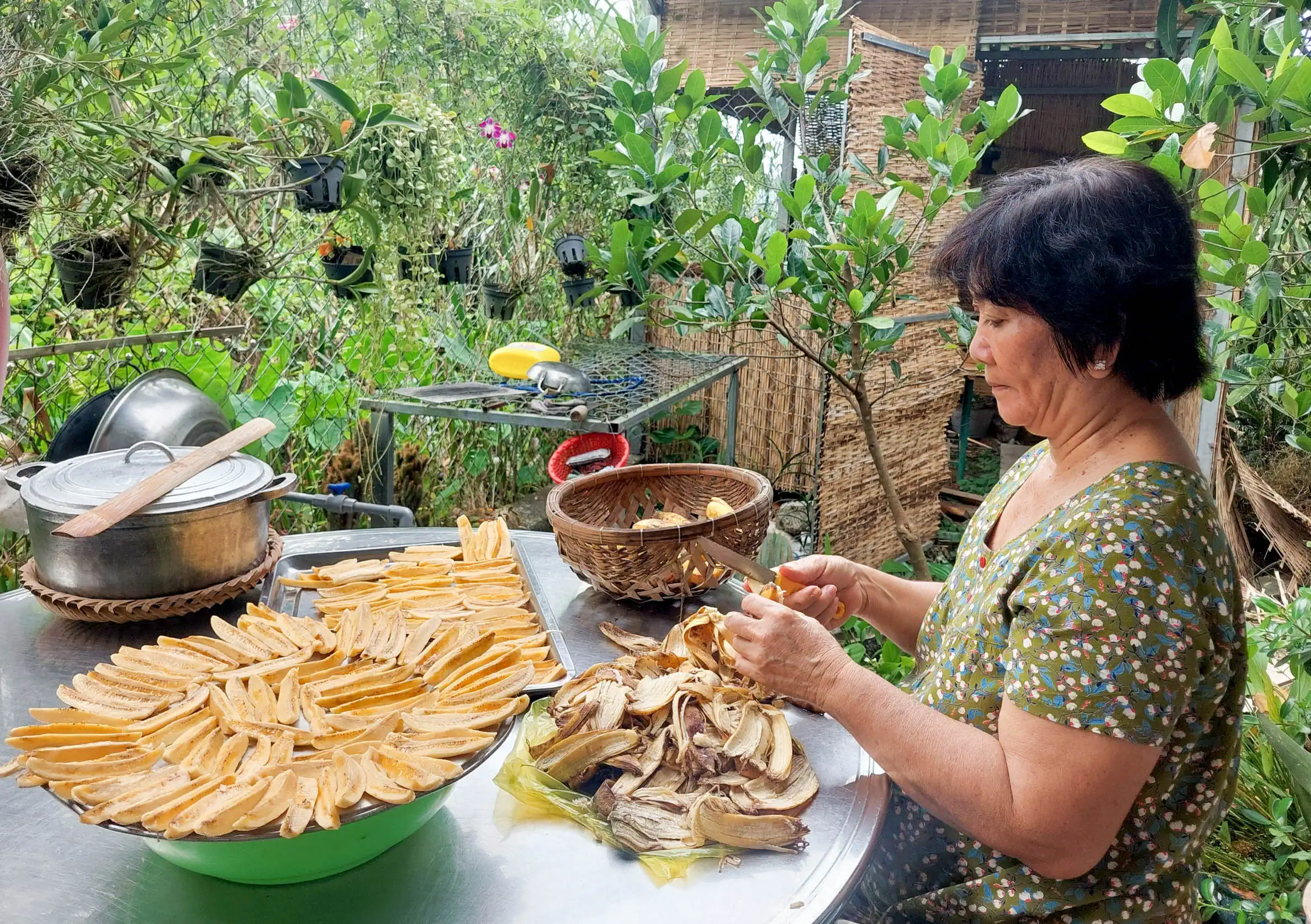 Má phơi chuối khô làm mứt. Ảnh: DUY KHÔI
