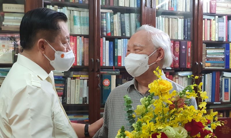 | Đồng chí Nguyễn Trọng Nghĩa thăm và chúc mừng Ngày Báo chí cách mạng Việt Nam tới nhà báo lão thành Phan Quang (Ảnh: HNV) |