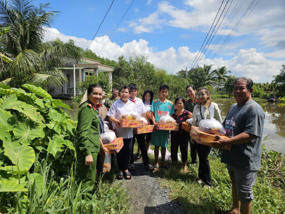 Đoàn công tác do Thiếu tá Nguyễn Thị Phương Nam - Trưởng Công an xã làm trưởng đoàn, đến tận nhà của 50 hộ dân để trao quà. Các phần quà gồm nhu yếu phẩm như gạo, mì gói, nước uống, cùng một số vật dụng sinh hoạt, giúp người dân ổn định cuộc sống sau thiên tai.