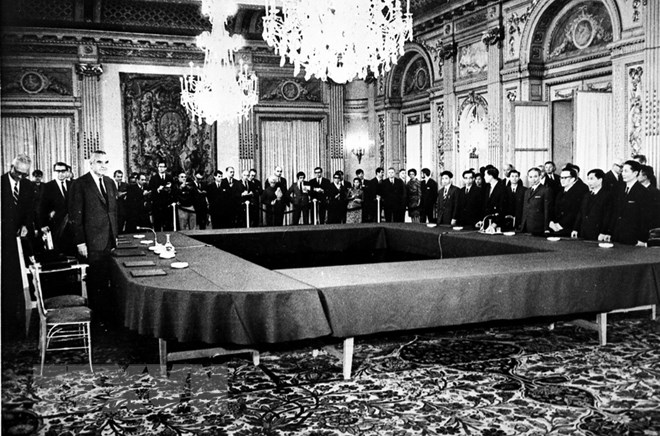 Cuộc nói chuyện chính giữa Chính phủ Việt Nam Dân chủ Cộng hòa và Chính phủ Hoa Kỳ về hòa bình ở Việt Nam tại Phòng họp Trung tâm Hội nghị Quốc tế ở Paris ngày 13/5/1968.(Đoàn Việt Nam ngồi phía bên phải). (Ảnh Tư liệu/TTXVN)