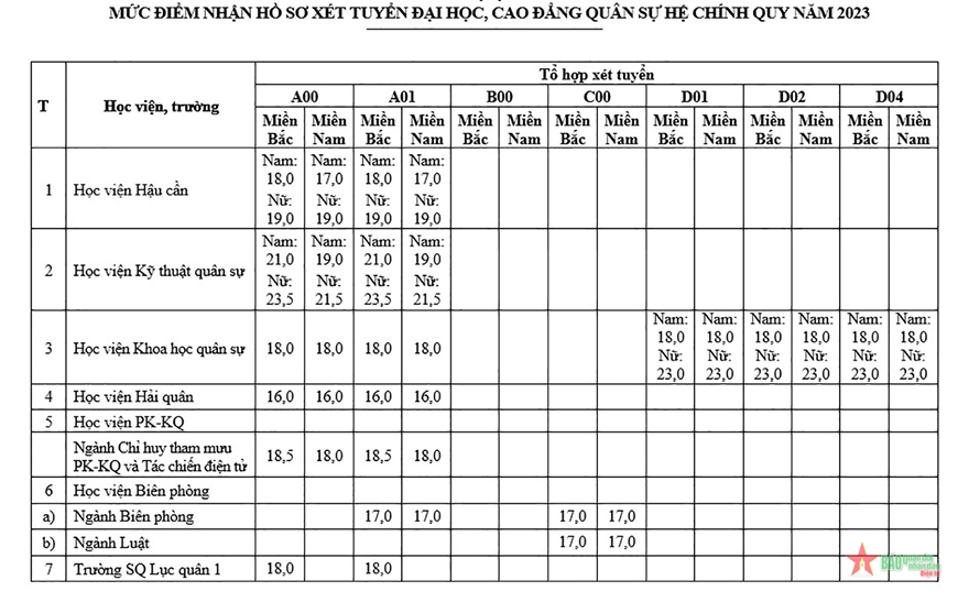 Riêng mức điểm nhận hồ sơ đăng ký xét tuyển của Học viện Quân y bằng với ngưỡng đảm bảo chất lượng đầu vào do Bộ GD&ĐT quy định đối với nhóm ngành sức khỏe năm 2023. Mức điểm nhận hồ sơ xét tuyển theo Tổ hợp D01, D02, D04 của Học viện Khoa học quân sự là điểm chưa nhân hệ số đối với môn Ngoại ngữ.