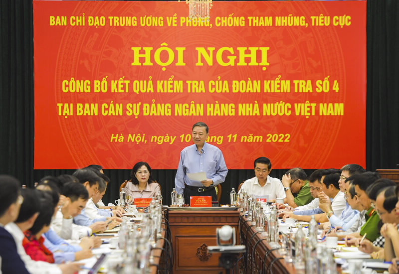 Phát biểu kết luận Hội nghị, Đại tướng Tô Lâm, Trưởng Đoàn kiểm tra ghi nhận và biểu dương những kết quả đạt được trong công tác PCTN, TC của ngành Ngân hàng, trong đó có nội dung công tác phát hiện, chuyển giao, tiếp nhận, giải quyết tố giác, tin báo về tội phạm, kiến nghị khởi tố các vụ việc có dấu hiệu tội phạm về tham nhũng, kinh tế, tiêu cực và công tác giám định, định giá tài sản trong giải quyết các vụ án, vụ việc tham nhũng, kinh tế, tiêu cực của Ban cán sự Đảng NHNN trong thời gian qua.