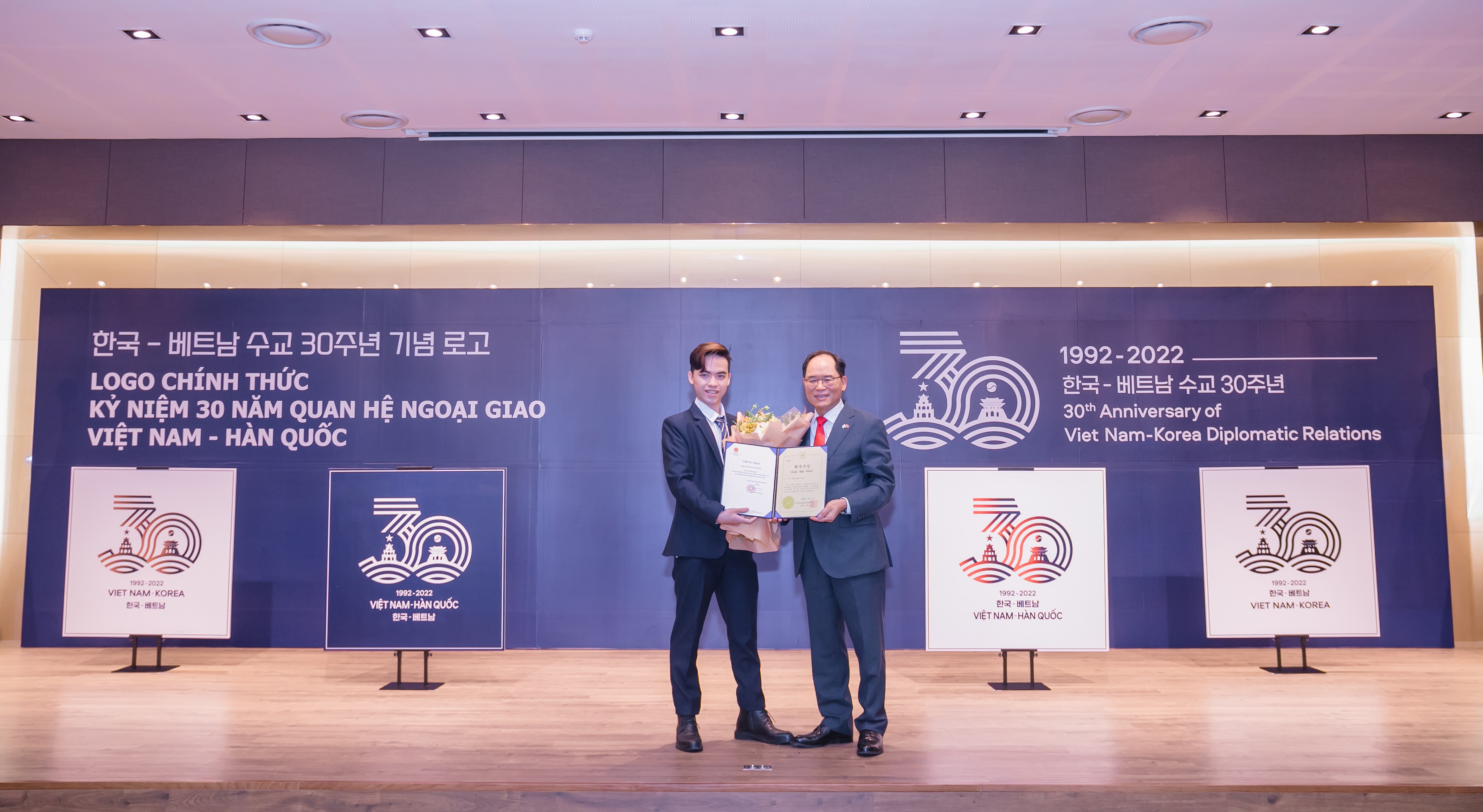 Trải qua các vòng bình chọn của các cán bộ, nhân viên Bộ Ngoại giao, Đại sứ quán hai nước và đánh giá chuyên môn của các chuyên gia trong lĩnh vực thiết kế, Ngô Quang Trung (sinh viên năm 4 trường Đại học Quốc gia thành phố Hồ Chí Minh, hiện đang sinh sống tại thành phố Hồ Chí Minh) đã được lựa chọn trao giải Đặc biệt với tác phẩm sử dụng hình ảnh quốc kỳ và những địa danh nổi tiếng đại diện cho hai nước, kết hợp cùng con số 30 để thể hiện tình hữu nghị 30 năm giữa Việt Nam và Hàn Quốc.