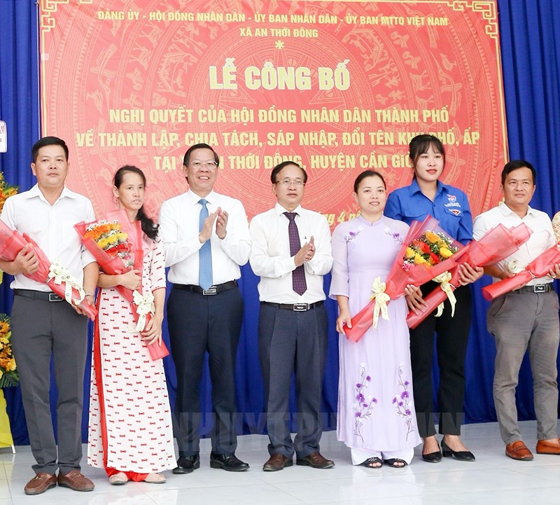 Sáng 13/4, Đảng ủy, HĐND, UBND, Ủy ban MTTQ Việt Nam xã An Thới Đông, huyện Cần Giờ (TP Hồ Chí Minh) tổ chức lễ công bố Nghị quyết số 11/NQ-HĐND của HĐND TP về thành lập, chia tách, sáp nhập, đổi tên khu phố, ấp trên địa bàn TP Hồ Chí Minh tại xã An Thới Đông. Đồng chí Phan Văn Mãi, Ủy viên Trung ương Đảng, Phó Bí thư Thành ủy, Chủ tịch UBND TP Hồ Chí Minh dự Lễ.