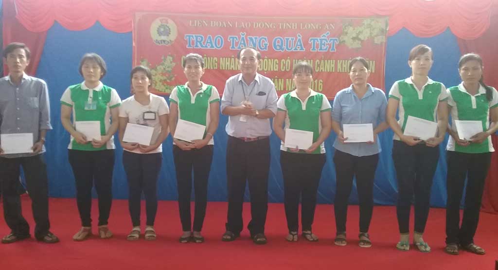 Tết Nguyên đán Bính Thân 2016, Liên đoàn Lao động (LĐLĐ) huyện Đức Hòa vận động các mạnh thường quân đóng góp trao tặng 200 phần quà cho CNLĐ tại các khu nhà trọ trên địa bàn.