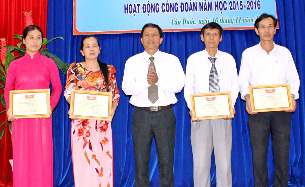 Ông Lê Phước Sử - Trưởng phòng Giáo dục và Đào tạo huyện Cần Đước tặng giấy khen cho các tập thể, cá nhân