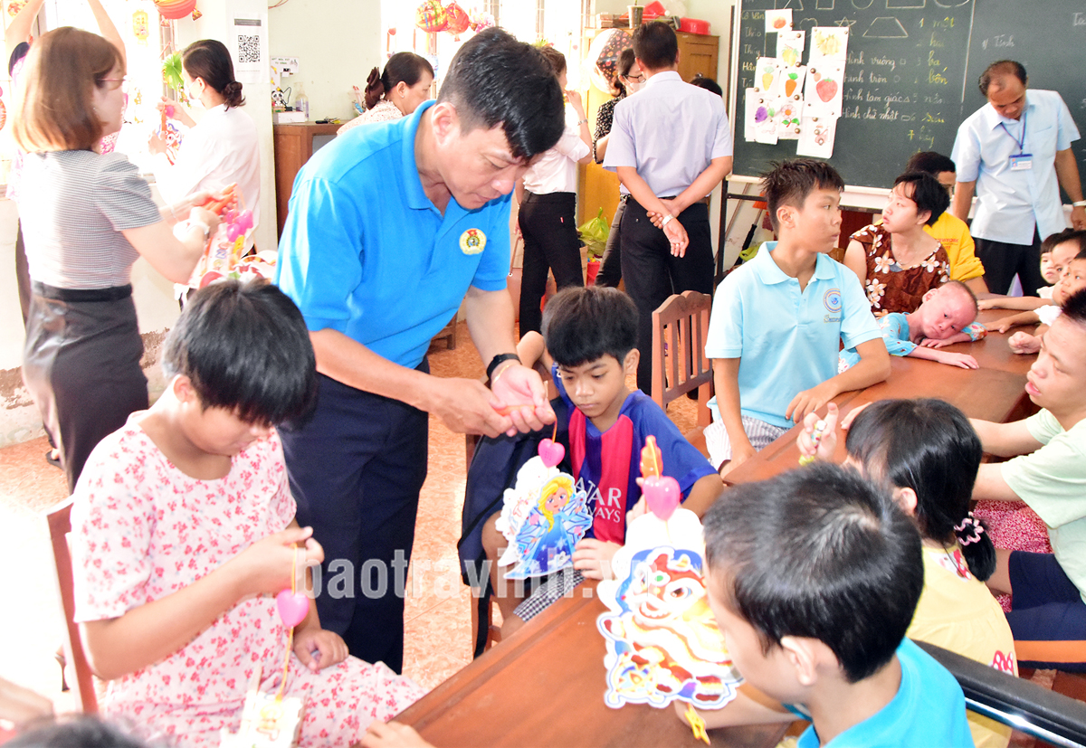 Đồng chí Đoàn Phúc Linh, Phó Chủ tịch Công đoàn Viên chức tỉnh ân cần thăm hỏi sức khỏe các cháu và tặng 17 phần quà cho trẻ em khuyết tật. Qua đây nhằm góp phần chia sẻ, tạo điều kiện cho các em được vui trung thu.