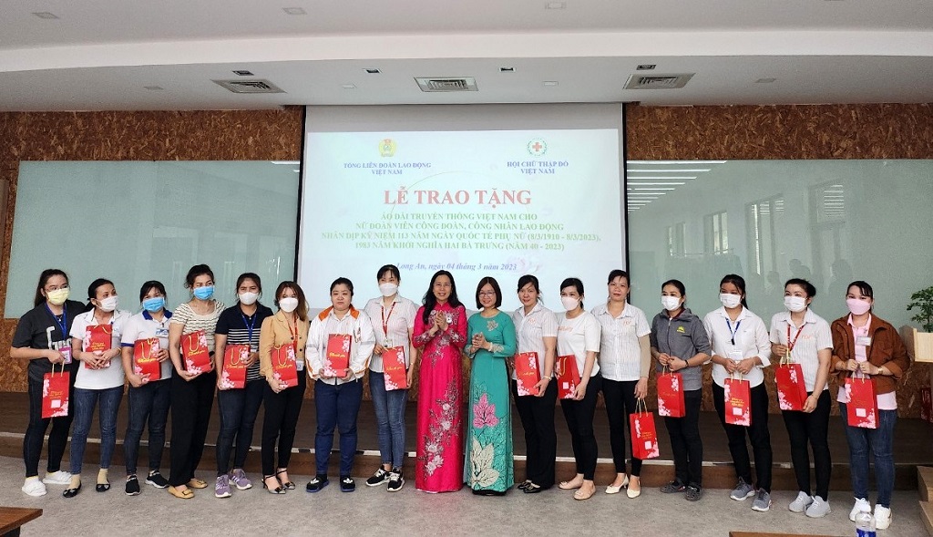 Tại Long An, chương trình trao tặng 376 chiếc áo dài cho nữ đoàn viên Công đoàn, CNLĐ. Đây là số áo dài do Tổng Liên đoàn Lao động Việt Nam và Hội Chữ thập đỏ Việt Nam hỗ trợ cho nữ đoàn viên Công đoàn, CNLĐ trên địa bàn tỉnh nhân dịp kỷ niệm 113 năm Ngày Quốc tế Phụ nữ 08/3 và 1983 năm Khởi nghĩa Hai Bà Trưng.