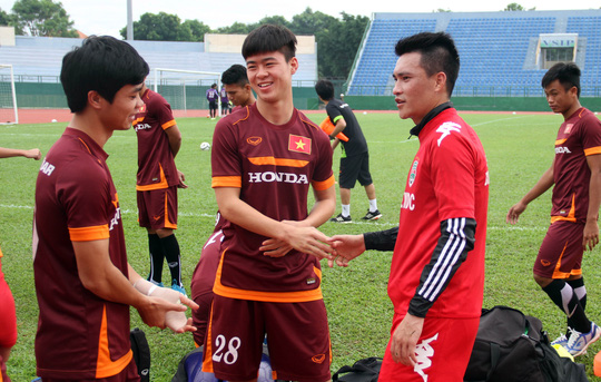 Công Phượng và Duy Mạnh (28) trong một lần trò chuyện với Công Vinh trên sân Bình DươngẢnh: Quang Liêm