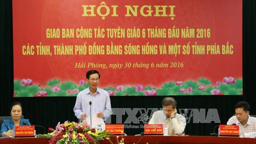 Theo báo cáo của Ban Tuyên giáo Trung ương, trong 6 tháng đầu năm, công tác tuyên giáo ở các tỉnh, thành đồng bằng sông Hồng và một số tỉnh Đông Bắc đạt được nhiều kết quả nổi bật như đổi mới tổ chức học tập, quán triệt Nghị quyết Đại hội XII của Đảng và Nghị quyết Đảng bộ các cấp nhiệm kỳ 2015- 2020; tích cực đóng góp vào sự thành công của cuộc bầu cử Đại biểu quốc hội khóa XIV và đại biểu HĐND các cấp, nhiệm kỳ 2016-2021.