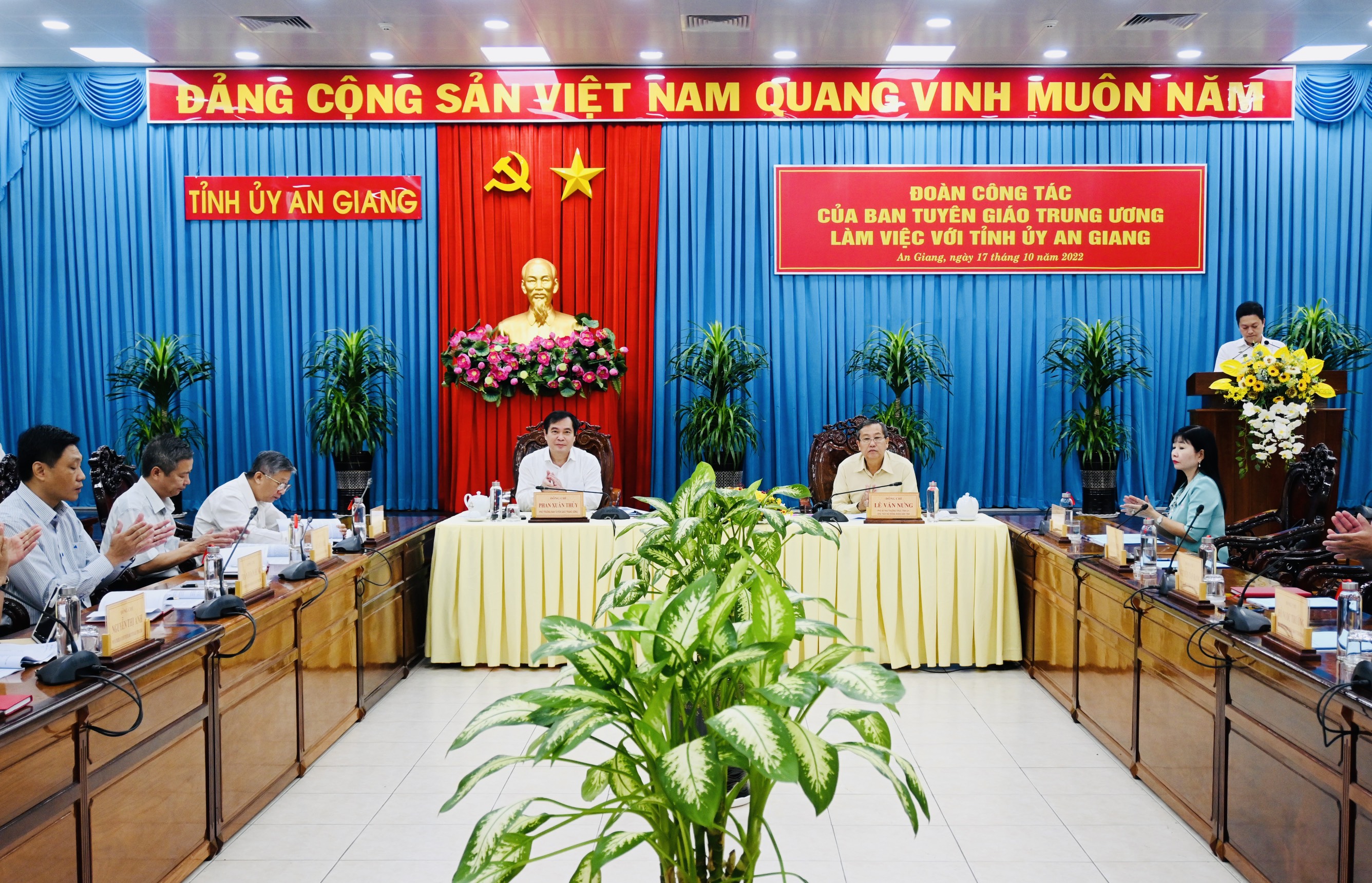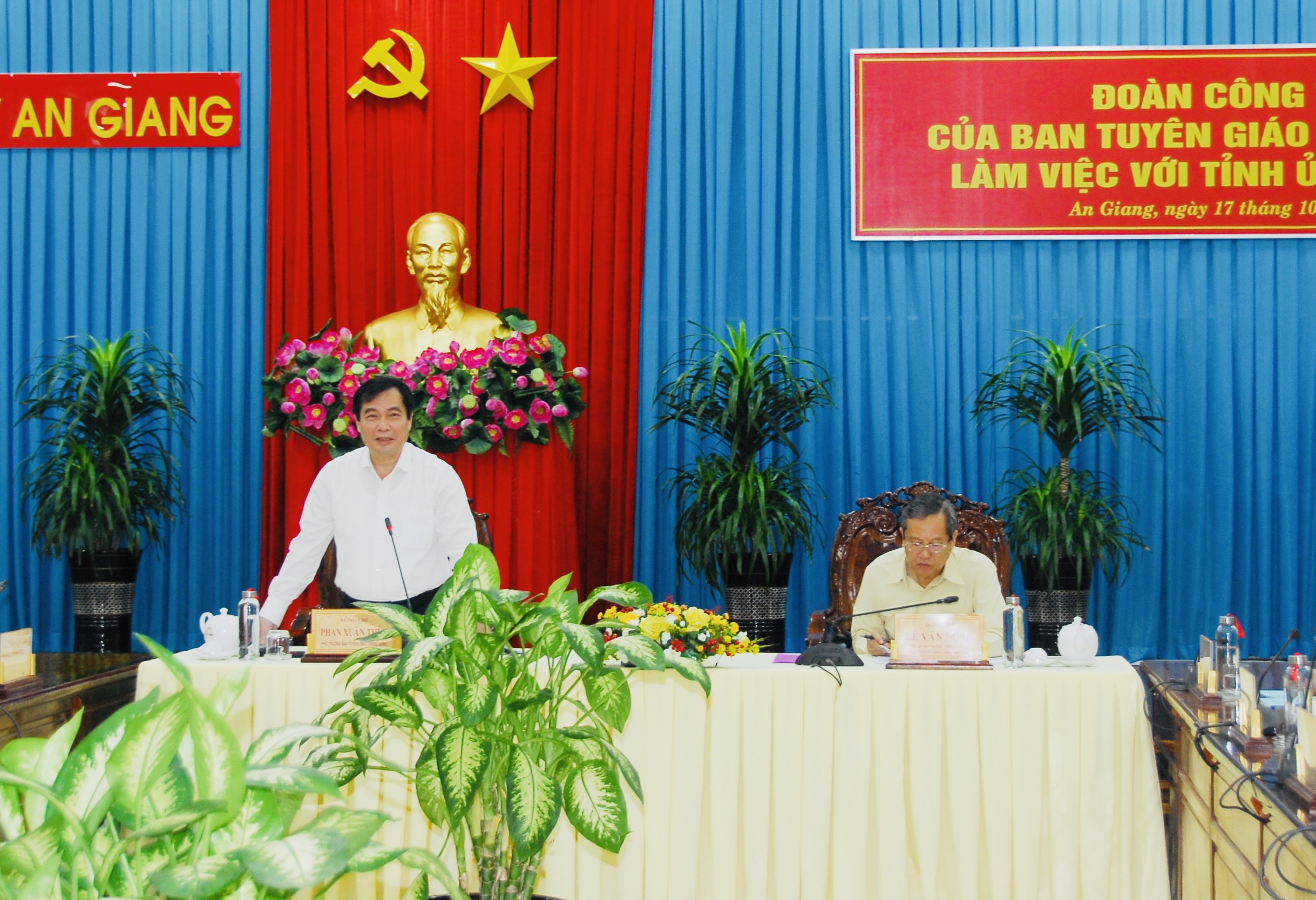 Ngày 17/10, Đoàn công tác Ban Tuyên giáo Trung ương do đồng chí Phan Xuân Thủy, Phó Trưởng Ban Tuyên giáo Trung ương làm Trưởng Đoàn đã có buổi làm việc với tỉnh An Giang.