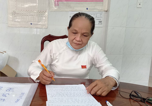 Bà Bùi Thị Nhị rà soát danh sách, đối tượng tiêm vắc-xin phòng Covid-19, hỗ trợ Trạm Y tế xã tổ chức tiêm vắc-xin mũi 2 cho người dân