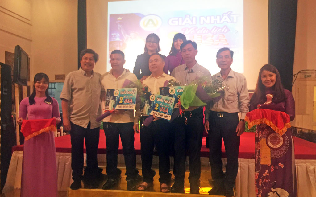 Nguyên Bí thư Tỉnh ủy Long An – Nguyễn Nam Việt (thứ 2 từ phải qua) trao thưởng cho đại lý may mắn trúng giải Nhất là chuyến du lịch Châu Âu trị giá 200 triệu đồng