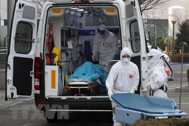 Nhân viên y tế chuyển bệnh nhân COVID-19 tới bệnh viện tại Seoul, Hàn Quốc, ngày 11/3/2022. (Ảnh: THX/TTXVN)