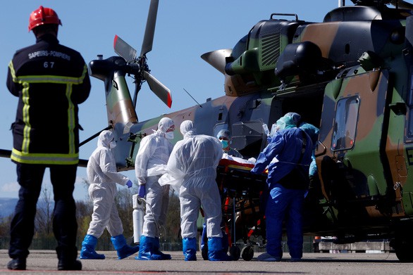 Một người bệnh COVID-19 được khiêng bằng cáng thương lên trực thăng Caiman của quân đội Pháp từ Strasbourg ra nước ngoài điều trị ngày 30/3. Ảnh: Reuters.
