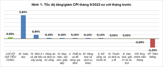 Cụ thể, trong 11 nhóm hàng hóa và dịch vụ tiêu dùng chính, 9 nhóm hàng có chỉ số tăng so với tháng 8/2022; 2 nhóm giảm, trong đó nhóm giao thông giảm 2,23% do giá xăng liên tục đi xuống ở các kỳ điều chỉnh trong tháng và nhóm bưu chính viễn thông giảm 0,04%. Đáng chú ý, nhóm giáo dục tháng 9 tăng 5,84% so với tháng trước, trong đó dịch vụ giáo dục tăng 6,48%, do thời gian miễn, giảm học phí trong đại dịch tại nhiều địa phương đã kết thúc, đồng thời một số tỉnh, thành phố thực hiện tăng học phí theo Nghị quyết của HĐND cấp tỉnh về việc quy định mức thu học phí, các khoản thu dịch vụ phục vụ và hỗ trợ hoạt động giáo dục từ năm học 2022-2023. Ngoài ra, một số cơ sở giáo dục ngoài công lập phải tự chủ về kinh phí điều chỉnh mức tăng học phí phù hợp với quy định. Bên cạnh đó, vào năm học mới nên nhu cầu mua sắm sách vở và các dụng cụ học tập tăng. Giá sách giáo khoa tăng 1,41%; giá vở, giấy viết các loại tăng 0,92%; bút viết các loại tăng 0,9% so với tháng 8/2022.