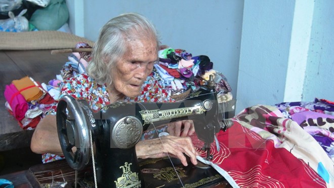 Cụ Màng cắt vải vụn để may chăn tặng người nghèo. (Ảnh: Thanh Tân/TTXVN)